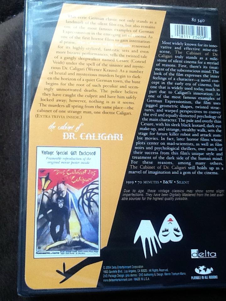Robert Wiene 2014: Back in Stock. Order here. We are based in South London near Croydon and if preferred this item can be picked up by appointment. Just e-mail here... UK Dvd Gallery added. Single Disc [2004] See scans for full details of any extra features or details of subtitles if any that can be found on this edition. Official release. Released by Delta 018111234092. 82 340. Due to age, these vintage classics may show some slight imperfections. They have been Digitally Mastered from the best available sources for the highest quality possible. As one of the first horror films to gain international praise, The Cabinet of Dr. Caligari, renowned for its highly-stylized, fantastic sets and even more bizarre performances, tells the twisted tale of a gangly sleepwalker named Cesare (Conrad Veidt) under the spell of the sinister and mysterious Dr. Caligari (Werner Krauss). As a number of brutal and mysterious murders begin to darken the horizon of a quiet German town, the hunt begins for the root of such peculiar and seemingly unmotivated deaths. The police believe they have caught the culprit and have him safely locked away; however, nothing is as it seems. The murders all spring from the same place - the cabinet of one strange man, one doctor Caligari. Most widely known for its innovative and effective mise-en-scene, The Cabinet of Dr. Caligari truly stands as a milestone of silent cinema for a myriad of reasons. First, there its treatment of the subconscious mind. The look of the film expresses the inner feelings of the character - a novel concept in the early era of cinema, but one that is widely used today, much in part due to Caligari's innovation. As one of the most famous examples of German Expressionidm, the film uses jagged geometric shapes, twisted structures, and warped perspectives to convey the evil and equally distorted psychology of the main character. The pale and overly thin Cesare, with his sleek black leotard, dark eye make-up, and strange, stealthy walk, sets the stage for future killer robot and attack zombie movies. In fact, later horror films whose plots enter on mad-scientists, as well as film noirs and psychological thrillers, owe much of their sucess from this film's unique style and treatment of the dark side of the human mind. For these reasons, among many others, The Cabinet of Dr. Caligari still holds up as a marvel of imagination and a gem of the cinema. Below are scans from the UK dvd. Useful to look at the back cover for details such as subtitles and special features sometimes missed in the text above. Time and again 'product descriptions' are wrong or are missing crucial information so it's really worth checking the scans below. If subtitles aren't mentioned on the back cover then they won't be on the Dvd. Click on each for bigger scans. Condition: New - still sealed. More details here. 2020: 1 back in stock. Official release. Condition: 'new - still sealed'. Payment can also be made to Lenin Imports by cheque, po, money order, bank transfer. Please enclose title of item ordering and return address. Address: Lenin Imports E-mail to reserve this item if paying by cheque or to request details for bank transfer. This is a Region 2 UK & Europe Dvd and will probaly not work on a US Dvd player. It should work on an Australian one but wherever you are outside Europe please check your Dvd player can play Region 2 Dvds. if you prefer to pay for this item offline via cheque or personal check please e-mail by clicking here. |