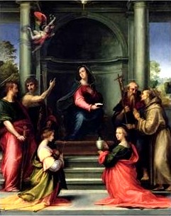 Fra Bartolommeo della Porta was apprenticed to Cosimo Rosselli in Florence in 1484. According to Vasari he was heavily influenced by Leonardo da Vinci even though Leonardo had possibly left for Milan in 1481/2 and left only a handful of works.In 1498, Bartolommeo was in the convent of San Marco. Savonarola was Prior at the time and when the convent was stormed and Savonarola was dragged off to prison (later executed), Bartolommeo vowed to become a monk. Two years later he did.