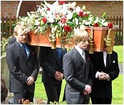 With grandson Crispian as one of his pallbearers (pictured above), the actor knight made his final journey into the church, followed by his children, Juliet, Hayley and Jonathan, and the rest of the family.