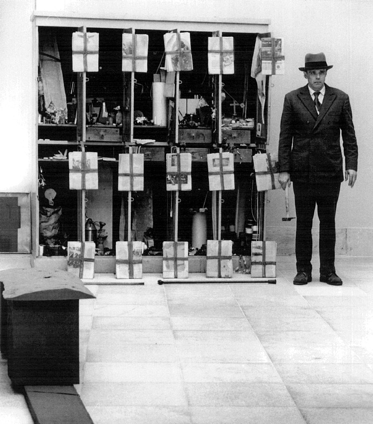 Beuys was appointed professor of monumental sculpture at the Staatliche Kunstakademie Düsseldorf in 1961. The year after, he began to associate with Fluxus [more] artists, principally Nam June Paik and George Maciunas, and later he met Minimalist artist Robert Morris. He helped to organize the Festum Fluxorum Fluxus at the Staatliche Kunstakademie Düsseldorf in 1963, and he participated for the first time in Documenta in Kassel in 1964.