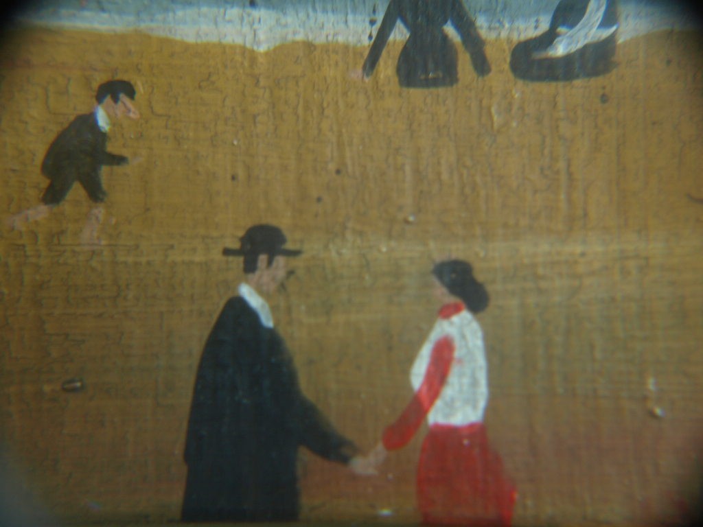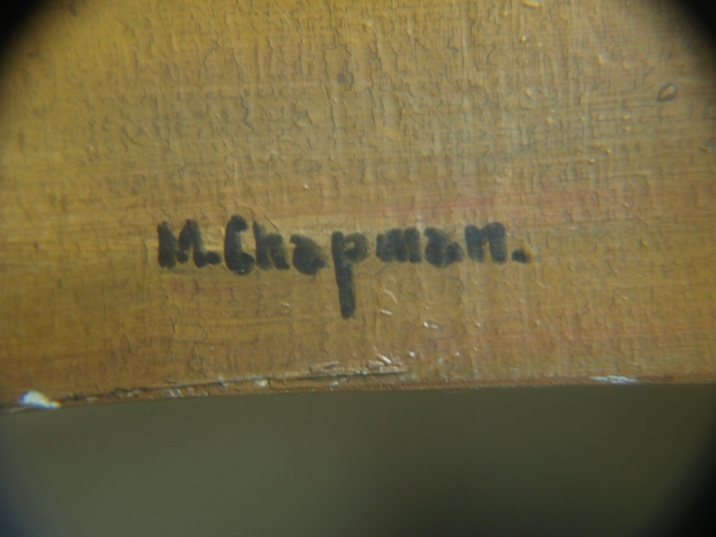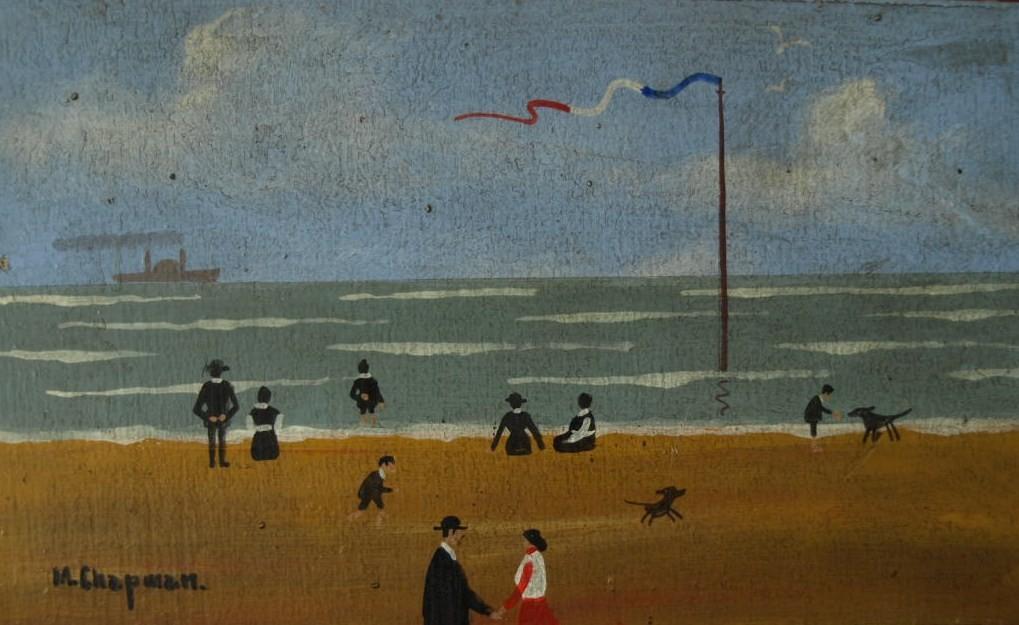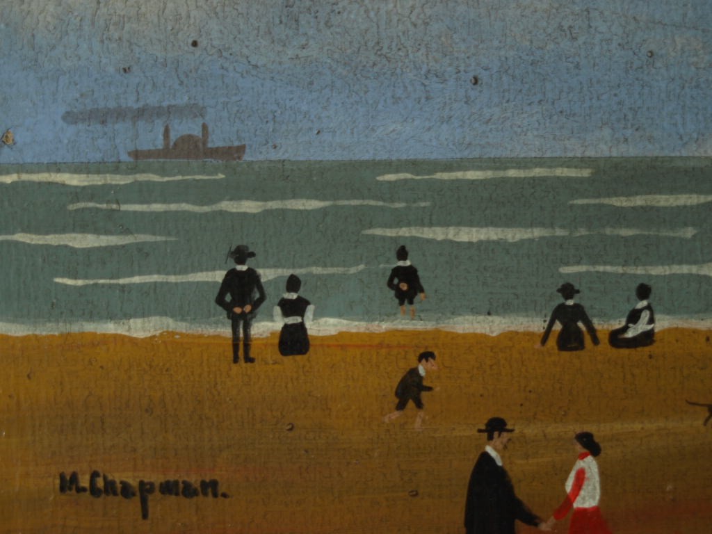 A lovely little oil on board signed M Chapman of Edwardian figures on a french beach, painted in a naïve style. Margeret Chapman studied at the Liverpool College of Art alongside John Lennon. Her street scenes and beach scenes drew comparisons with LS Lowry.