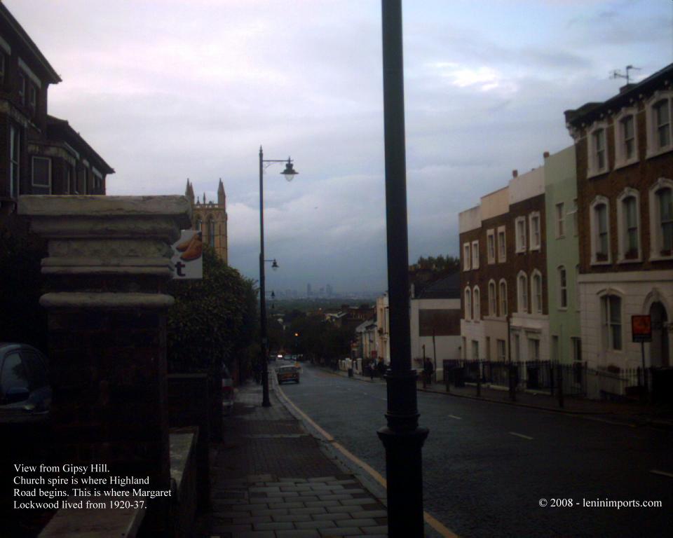 At the age of 4, in 1920, Margaret Lockwood moved from India with her mother and older brother, Lyn, to Upper Norwood by Gipsy Hill, Crystal Palace, South London. They rented first at 2 Lunham Road, in a large upstairs maisonette (pictured) and then moved into the next street, Highland Road, first at 18A and then to a bigger house at No. 30 in which they occupied the whole house. Unfortunately, Highland Rd was bombed during the war and though part of the road survived (pictured), Margaret's homes were lost. I have pictured what is there now (2008).This attractive part of South London (with as pictured it's breathtaking views of the City of London) was in all her home for 17 years until her marriage in 1937 to Rupert Leon, when they moved to a flat in Dolphin Square, near Victoria. I have photographed the surrounding area as well and if you click here you will see pictures of Crystal Palace Park which, in Margaret's day, dominated the whole neighbourhood. Here it was where her and her brother played though by the time they lived there the palace's fairy-tale reputation was a thing of the past. But they used it extensively and even today a visit to it will tell you why. It's a wonderful place though the actual Palace burned down in 1936 and all that remains are the terraces. These photos are not to be used anywhere else without prior permission from me. Just e-mail any request.