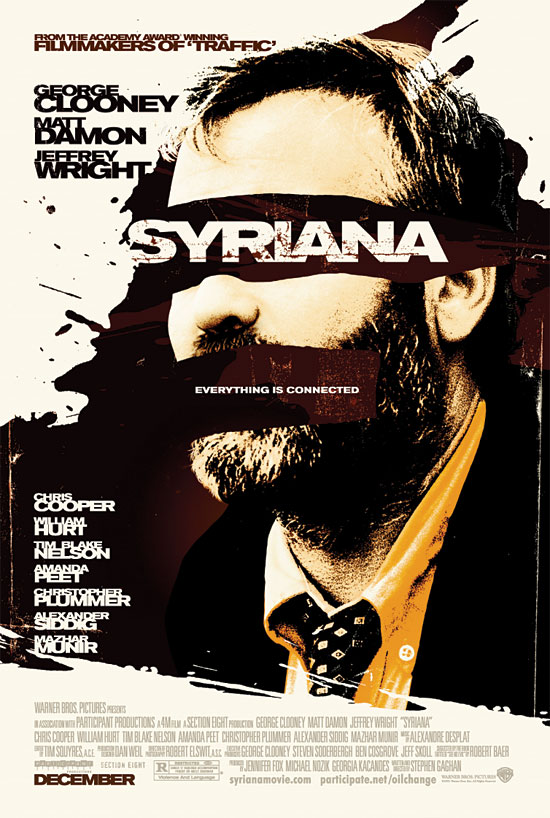 GALLERY | BRIEF NOTES | OFFICIAL WEBSITE Political Thriller. Tim Blake Nelson as Danny Dalton to Jeffrey Wright as Bennett Holiday From writer/director Stephen Gaghan, winner of the Best Screenplay Academy Award for Traffic, comes Syriana, a political thriller that unfolds against the intrigues and corruption of the global oil industry. From the players brokering back-room deals in Washington to the men toiling in the oil fields of the Persian Gulf, the film’s multiple storylines weave together to illuminate the human consequences of the fierce pursuit of wealth and power. The intrigue takes place against the backdrop of an oil-producing Gulf country, where young, charismatic and reform-minded Prince Nasir (ALEXANDER SIDDIG) is seeking to change long-established relationships with U.S. business interests. Nasir, the apparent heir to the throne, has just granted natural gas drilling rights – long held by Connex, a Texas energy giant – to a higher Chinese bid. This is a huge blow to Connex and American business interests in the region. Killen, a smaller Texas oil company owned by Jimmy Pope (CHRIS COOPER), has just won the very competitive drilling rights to coveted fields in Kazakhstan. This makes Killen very attractive to Connex, who now needs new territory to maintain its production capacity. When the two companies merge, the pending deal attracts the scrutiny of the Justice Dept., and Sloan Whiting, a powerful white-shoe Washington law firm, is brought in to perform due diligence. Bob Barnes (GEORGE CLOONEY) is a veteran CIA agent nearing the end of a long and respectable career, with a son headed for college (MAX MINGHELLA) and the possibility of spending the latter days of his service in a cushy desk job. A devoted company man, Bob’s always been a true believer that his work benefits his government and makes his country a safer place. In Bob’s last assignment, an assassination of two arms dealers in Tehran, a Stinger missile falls into the hands of a mysterious blue-eyed Egyptian. On his return to Washington, Bob is promised a promotion after one last undercover mission – assassinating Prince Nasir. But when one of his field contacts turns on him and the assassination attempt goes terribly awry, Bob is scapegoated by the CIA, betrayed by the organization to which he has devoted his life. As he searches to understand what has happened, he begins to realize that he has been lied to – used as a pawn and never privy to the real motivation for the assignments he has blindly carried out for years. Bennett Holiday (JEFFREY WRIGHT) is an ambitious Washington attorney at Sloan Whiting, in charge of the delicate task of guiding the Connex-Killen merger through the deep waters of D.C. He needs to give the Justice Department enough material to make their case against Killen for its shady dealings in Kazakhstan without jeopardizing the entire deal. It’s in the company and the country’s interest that the merger go through. It also serves Bennett’s ambitions – ambitions fueled by a father (WILLIAM C. MITCHELL) he is constantly at odds with. Energy analyst Bryan Woodman (MATT DAMON) is a rising star at an Energy Trading Company, living with his wife Julie (AMANDA PEET) and their two young sons in Geneva. When he attends a party thrown by Prince Nasir’s family, a tragic accident results in the death of Bryan’s young son. Nasir attempts to make amends for what happened, offering Bryan a business opportunity to help the young leader realize his reformist ideas – an opportunity Bryan embraces, to the dismay of his grieving wife. Dean Whiting (CHRISTOPHER PLUMMER), Bennett’s boss, the head of Sloan Whiting and one of the most powerful men in Washington, is trying to undo Nasir’s deal with the Chinese. He knows that Nasir’s younger, more callow brother, Prince Meshal (AKBAR KURTHA), will be more amenable to American business interests and he pressures the aging Emir to choose his younger son to succeed him, effectively engineering Nasir’s political demise. At the other end of the wage scale in Nasir’s country are the migrant laborers toiling in its energy fields, whose lives are directly and drastically affected by the royal family’s policies and the vagaries of the industry. Connex workers Saleem Ahmed Kahn (SHAHID AHMED) and his son Wasim (MAZHAR MUNIR) have just been laid off from their jobs in the fields when the Chinese take them over, and their future becomes increasingly uncertain as they search in vain for work before their visas run out. Saleem dreams of someday returning to Pakistan; his son hopes for a better life but quickly becomes disillusioned and angry at the way he and his father are treated as immigrant workers in the Gulf. Wasim and his friend Farooq (SONNELL DADRAL) find solace at the local madrassa, a place where they are treated with dignity in an otherwise bleak and unfamiliar world. At the madrassa, Wasim and Farooq are taken under the wing of a charismatic and dangerous recruiter – the blue-eyed Egyptian with the missing Stinger missile. Sheiks and field workers, government inspectors and international spies, rich and poor, the famous and infamous – each plays their small part in the vast and complex system that powers the industry, none realizing the true extent of the explosive impact their lives will have upon the world. Warner Bros. Pictures presents, in association with Participant Productions, a 4M film, a Section Eight production, GEORGE CLOONEY, MATT DAMON and JEFFREY WRIGHT in Syriana. The film also stars CHRIS COOPER, WILLIAM HURT, MAZHAR MUNIR, TIM BLAKE NELSON, AMANDA PEET, CHRISTOPHER PLUMMER and ALEXANDER SIDDIG. Written and directed by STEPHEN GAGHAN, the film was suggested by the book See No Evil by ROBERT BAER, and is produced by JENNIFER FOX, MICHAEL NOZIK and GEORGIA KACANDES. The executive producers are GEORGE CLOONEY, STEVEN SODERBERGH, BEN COSGROVE and JEFF SKOLL. The director of photography is ROBERT ELSWIT, A.S.C.