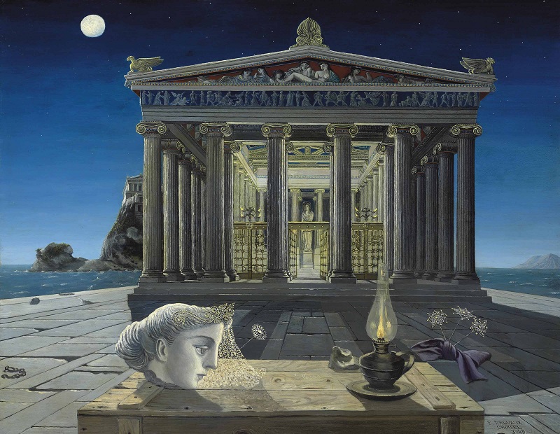 The artist visited Italy in 1938 and 1939, where the classical architecture and ruins would profoundly influence his artistic vocabulary. The columns, temples, and arcades that populate his paintings speak to this Italian encounter, transformed into mysterious stage sets for his enigmatic narratives.
